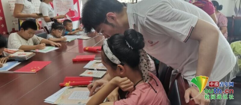 图为实践队员辅导小朋友普通话读音问题场景。中国青年网通讯员 陈鑫磊 供图