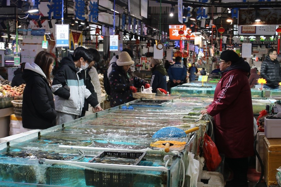 2月3号下午,实践队成员来到石臼海鲜市场。通过与市场负责人交流,实践队成员了解到整个市场规模宏大,占地面积广阔,划分成多个功能区域,布局合理有序。海鲜交易区是核心区域,这里摊位众多,密密麻麻排列在一起,摆满各种海鲜产品,如帝王蟹、虾虎、鱿鱼等。除了海鲜交易区,还有干货区,售卖多种经过晾晒、风干处理的海鲜干货,如干贝、虾米、鱼干等,这些干货易于保存和携带,深受游客喜爱。此外,市场内还设有加工区,当地居民或游客购买完海鲜后,可以在这里挑选心仪的餐馆,让厨师对新鲜食材进行加工,现场品尝原汁原味的海鲜大餐。