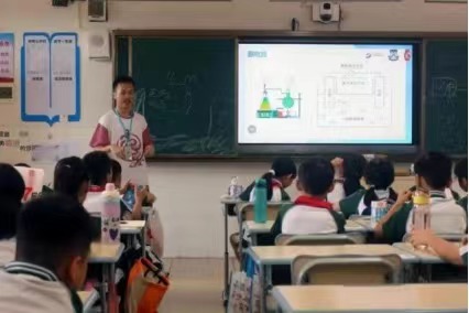 在“电池探秘之旅”课程中,黄坤带同学们进入电池的神奇世界,首先黄坤以自然界中的电开头,使用自媒体进行科学实验模拟,向同学们展示静电的奥秘,接着简述人类存储电的历史,进而引入电池,让同学们走进化学史,了解科学家在科学探索时的故事,并学习科学家的科研精神。从普通的干电池到高科技的锂离子电池,黄坤与同学们一同揭开电池背后的奥秘,探索它们在手机、电动车和太阳能系统等现代生活中的无处不在的应用。接着黄坤以更加符合学生学情的方式去讲解电池的基本原理。通过这趟电池探索之旅,同学们不仅了解电池对环境的影响,更会学会正确的使用和回收方法,收获环保知识。课堂的最后黄坤进行实验操作,使用盐水、铜片铁片、导线为材料制备简易的原电池,激发同学们的科学好奇心,让同学们体验科学的乐趣。