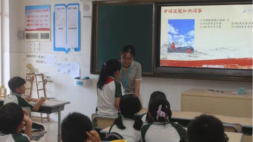 在红色边防讲解课堂中,孙乐以国家地理知识导入课堂。从国土面积到中国海岸线全长,学生们开动脑筋,举起手来积极与教师抢答,展现了学生们丰富的知识储备。