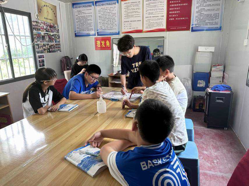 夏日的阳光如同熔金般倾泻而下,将大地染上了一层耀眼的金黄。郁郁葱葱的树木在微风中轻轻摇曳,绿叶间闪烁着细碎的光斑,仿佛是天空洒落的星辰。蝉鸣声此起彼伏,交织成夏日独有的交响乐,热烈而充满活力。远处,一片无垠的稻田泛着绿油油的波光,在微风的吹拂下泛起层层细腻的涟漪,宛如一片绿色的海洋。午后,偶尔飘过几朵悠闲的白云,为这炽热的季节增添了几分宁静与遐想。七月的孙家卫,是那样地热烈、绚烂而又充满生机,让人沉醉不已。这里的学生们也是如此纯粹,他们会早早地来到教室,等候老师的到来;他们会在课前认真预习将要学习的内容,课后及时完成老师布置的作业与任务,在老师们的指导下学会使用思维导图等方式巩固所学;他们会在课堂上认真听讲,积极与老师们互动,思考老师们问的每一个问题;他们也会在课间休息玩耍,劳逸结合。同学们的每一个反应、每一次互动,也都如同一颗颗璀璨的星辰,照亮了我们的支教之路。