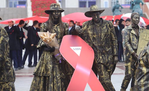 高校用行为艺术宣传防艾,学生扮铜人创意十足