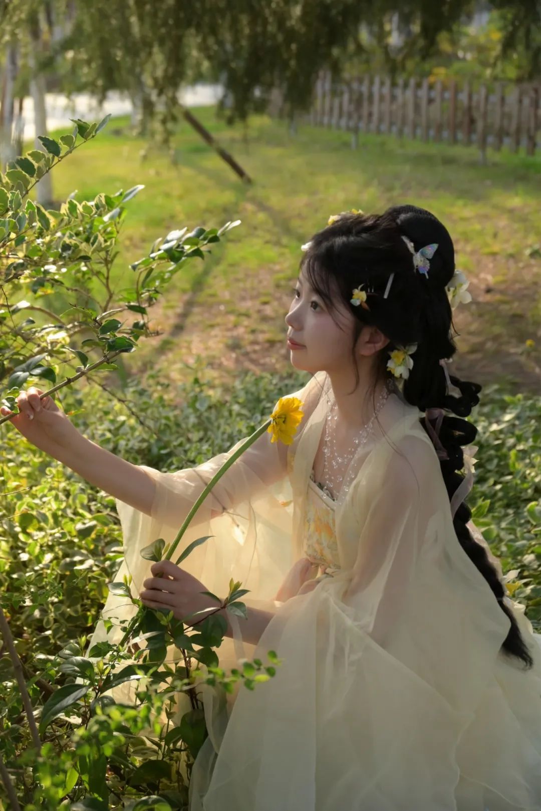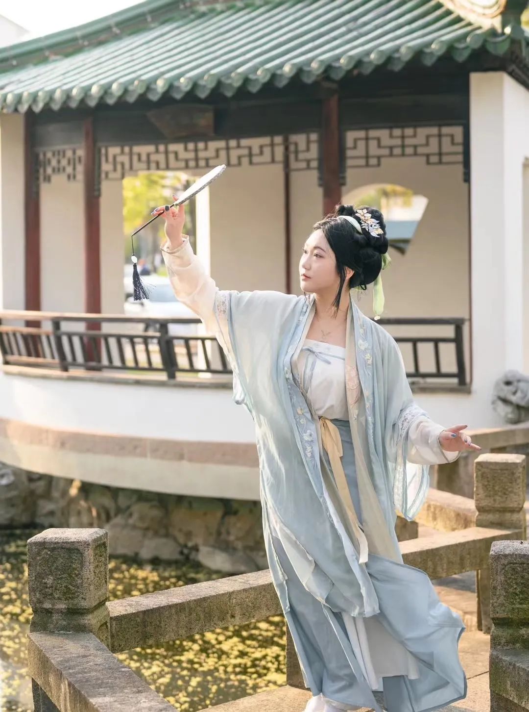 诃子裙外衫配以大袖衫,绣纹繁复华美;下裙轻盈飘逸,如行云流水。面料多采用丝绸棉麻等轻薄面料,行步时便可达广袖垂云、裙澜生雾之境。
