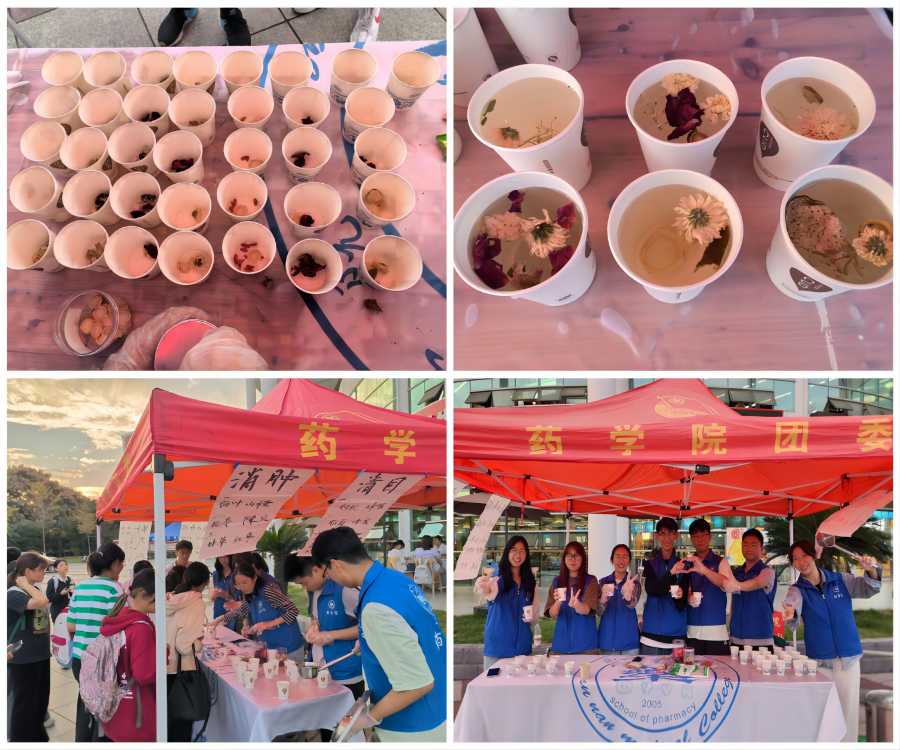 活动过程中,同学们纷纷品尝中药茶饮,同时对中药文化也有浓厚的兴趣。"瑞香"小组成员一边积极地为同学们介绍中药茶饮的功效,一边给来往的同学分发茶饮。
