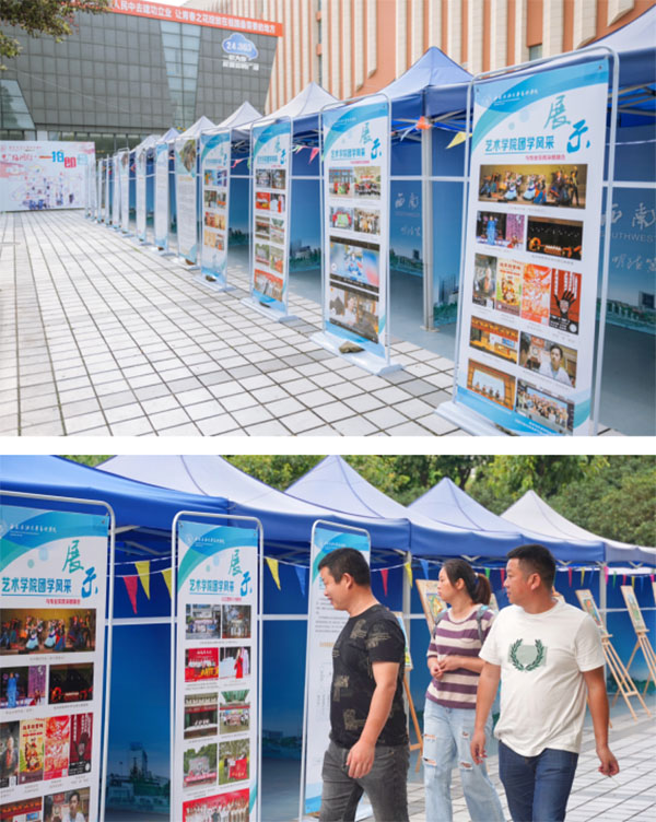 除此之外,在迎新外场还摆放着介绍艺术学院各种学院活动以及优秀毕业生的展示架,同样吸引了一大批学生和家长驻足观看。一直以来,艺术学院秉承“德艺周厚,知行合一”的院训,定期开展各项专业实践培训和主题活动,丰富同学们的日常学习和生活,并培养出了一批批优秀的学子,在各个领域发光发热。希望新同学们在来到艺术学院后,也能坚定目标、勇往直前,实现自己的理想。