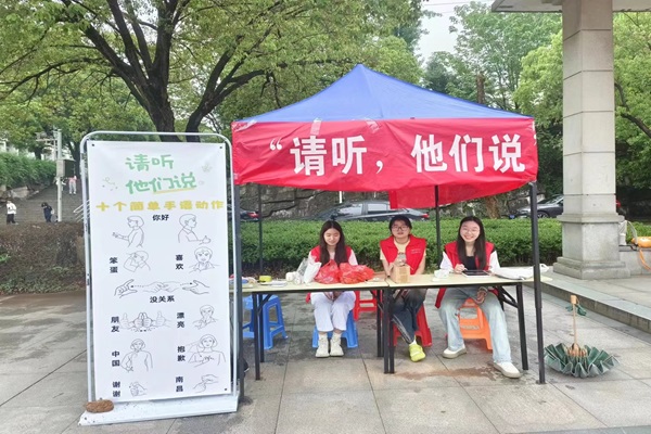 “手语传情,让爱发声”,为提升大众对聋哑群体的关注度,增强同学们对手语的认识和了解,促进无障碍交流,江西财经大学义工协会爱积部于4月25日至4月26日,在江西财经大学麦庐园校区十二生肖广场面向全体师生举办“请听,他们说”手语学习活动。