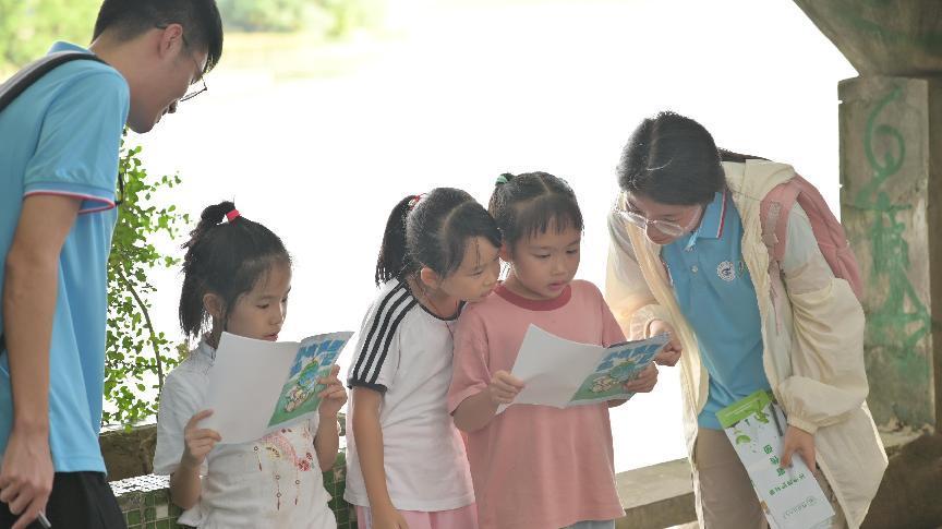 (图为实践团队员们为儿童们讲解环保宣传手册)