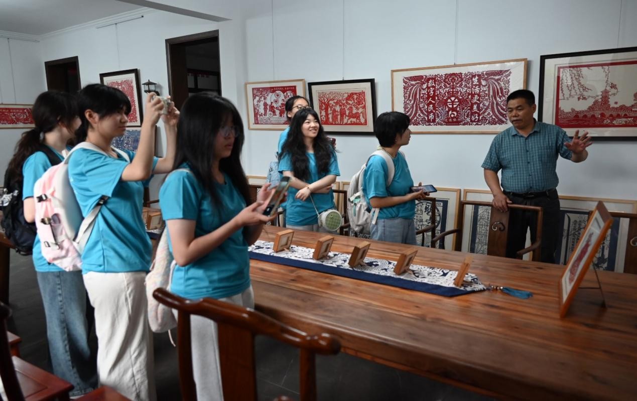 图为在阜阳程氏剪纸文化艺术有限公司,阜阳剪纸的第二代传承人程兴红先生正在为我们讲解剪纸作品的创作背景以及文化内涵,成员们在欣赏剪纸作品的同时也被这些丰富意蕴所打动。 魏梦昕 供图