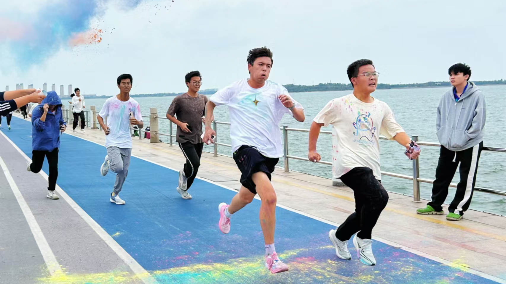 活动伊始,主持人罗蓉蓉为参与者介绍色彩跑相关规则,参与同学手捧彩粉,跃跃欲试。“3,2,1,出发!”主持人一声令下,一抹抹炫彩绽放于蓝天之下,或落到跑道上,或沾到同学们的脸颊和衣服上,粉末飞扬,少年身披彩虹奔向终点,展现着属于他们的青春。活动过程中,志愿者沿途泼洒彩粉,将整场活动推向高潮,加油呐喊声与飞扬的彩粉交织出色彩斑斓的世界。3公里的征途,少年们奋力奔跑,即使感到疲累,也没有停下前进的步伐。终点处,漫天的绚丽庆祝着他们的到来,少年们的脸上绽放着笑容。第一位到达终点的同学亚迪佧尔·阿力木江说:“参加这个活动太有意义了,不光是庆祝祖国七十五周年华诞,在这个过程中,我也充实了自身,让我对于未来感到更加坚定”。