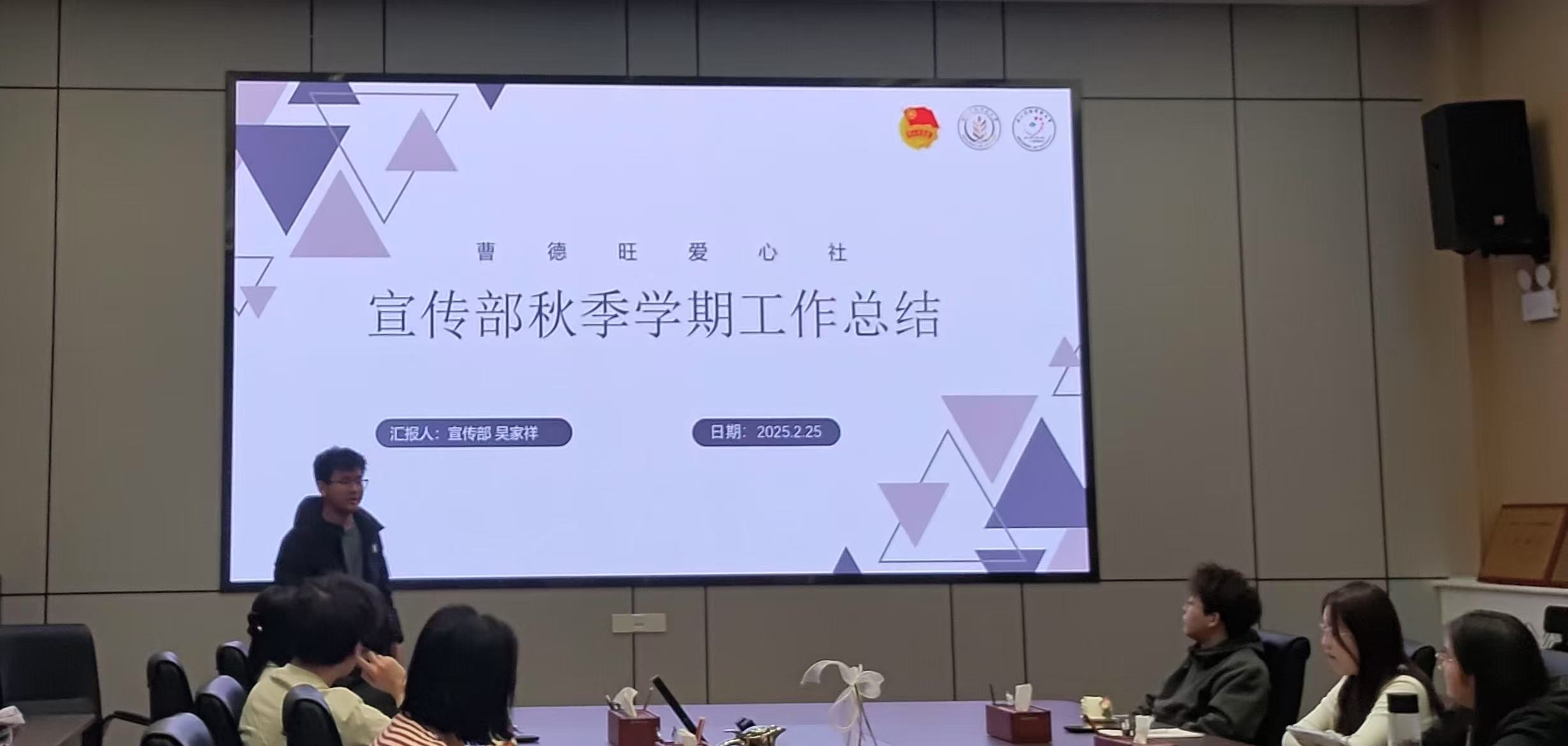 为推进新学期社团工作顺利开展,近日,校团委曹德旺爱心社于学生处思九厅开展新学期第一次部门例会,由社长拓洋洋主持,在社团指导老师胡海艳及各部门负责人在内共20名同学的积极参与下顺利召开。会议总结社团过往工作成效,部署新学期重点任务,并就“建立学院分社”等规划展开深入研讨。
