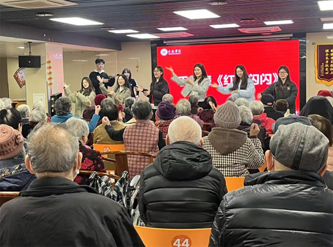 演出结束后,同学们化身“温情大使”,带领爷爷奶奶们学习《红星闪闪》手势舞。在愉悦欢快的节奏里,大家共同重温红色经典,感受音乐与舞蹈的魅力。爷爷奶奶们认真学习、积极参与,现场洋溢着温馨与欢乐。