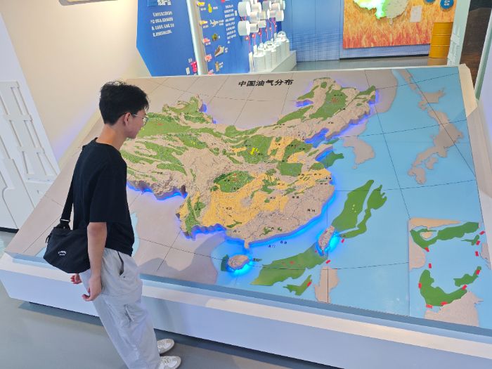 学期内的积累为实践打下坚实基础,暑期伊始,实践队首站奔赴中原文化宫,开启石油文化寻根之旅。踏入文化宫,队员们跟随讲解员的脚步,在陈列的老照片、钻机模型、油田开发史料前驻足。从展示“艰苦创业”历程的实物展区,到呈现“智慧转型”成果的科技展板,大家逐一探寻中原油田从勘探开发到创新发展的脉络——老钻机模型诉说着初代建设者的坚守,数据图表展现着油田技术的迭代升级。队员们边听边记、不时交流,将书本上抽象的“石油精神”,与中原油田的真实奋斗故事、文化积淀深度联结,为后续实践与宣讲收集到最鲜活的素材。