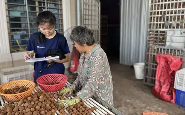 7月,中山大学岭南学院学生在广东省茂名市高州市调研,当地村民在荔枝选果、装箱时接受学生的访谈。