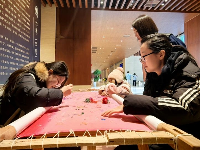 图 队员们在展馆负责人指导下体验宋绣技术