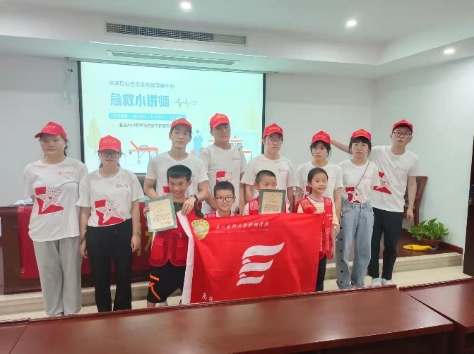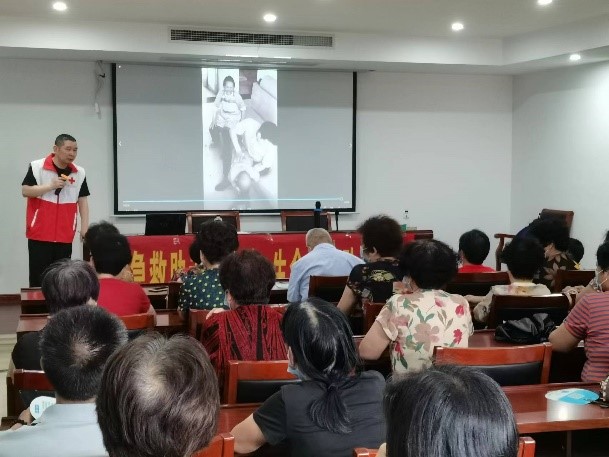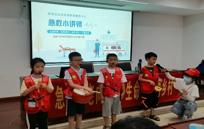 活动开始前,志愿者们提前到达布置好会场,由于天气炎热,街道也贴心地为志愿者们准备了饮用水.活动如期进行,小朋友们为老人们表演节目《三句半》,为老人们宣传了急救知识的同时,也增加了活动的趣味性.志愿者以及校团委贴心地慰问了在仙岩街道党群服务中心的老人,现场气氛温馨和谐,老人们在服务中心感受到了大家对他们诚挚的爱心.老师精心准备了关于心肺复苏的PPT,讲课过程中认真细致地讲解了心肺复苏的注意事项和具体操作,语言生动,浅显易懂,老人们也很快能够明白。老师在进行心肺复苏实操时积极的与老人们互动,每个要点结合具体动作十分精彩,老人们也积极配合,上台练习心肺复苏操作。在老师同学们的努力和老人们积极配合下,现场氛围很好,秩序井然,是一次很有意义的活动。