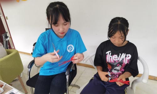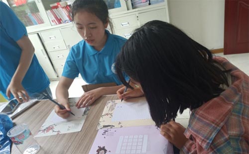为弘扬中华优秀传统文化,并同时增强留守儿童的爱国热情,团队开展了书法练习、编织中国结等活动。每一个队员积极参与其中,队员之间配合默契,队员和孩子们一起写字、做手工,与孩子们相处融洽,营造了浓厚的文化氛围。团队成员在村委会活动室与孩子们一起用古诗词来练习书法,手把手教授孩子们编织中国结,剪窗花,辅导孩子们的学习功课,每一位队员都饱含热情,孩子们也乐在其中,感受到了中华优秀传统文化的魅力。