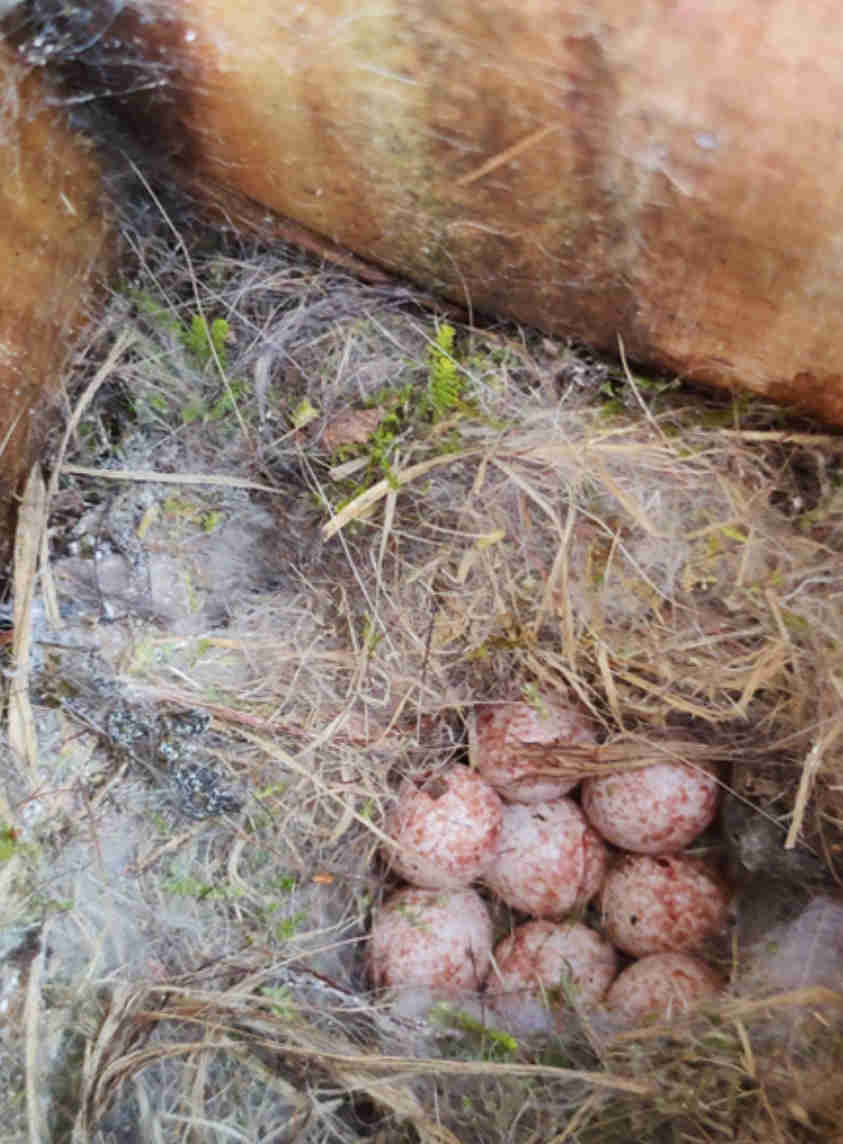 队员跟随领队对未孵化的鸟蛋进行了详细的观察。鸟蛋是白眉姬鹟的蛋,直径一厘米左右,颜色为白底、带有红色斑点。考虑到夏季已经是鸟类孵化迁徙的后期,教授推测这窝鸟蛋的父母,可能因为有蛇类或者其他的危险因素,已经抛弃了这个窝,这种行为学名弃巢。对于这种情形,该队成员认为需要工作人员稍加干涉,确保这些鸟蛋的安全。