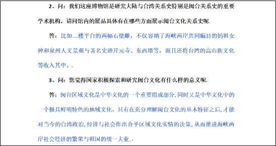 )通过我们对博物馆内工作人员和游客的采访,我们发现大家对闽台文化有着相同的起源持肯定态度,同时他们也认为宣传闽台文化很有必要,他们也为宣传闽台文化的方式提出了自己的建议,如各大短视频平台、书籍、日刊等。