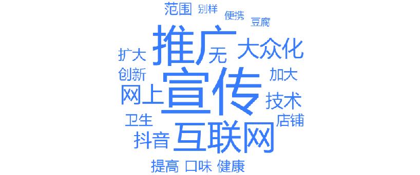 对于“对于神仙豆腐的标准化推广”,由图11的词云图可以看出,许多受访者对“神仙豆腐”的卫生与健康,口味与创新,以及携带性等特点提出了建议。其中,大部分受访者均认为“神仙豆腐”产业应当扩大互联网渠道的宣传与推广力度,提升“神仙豆腐”的大众化消费等,例如利用抖音加大宣传力度。