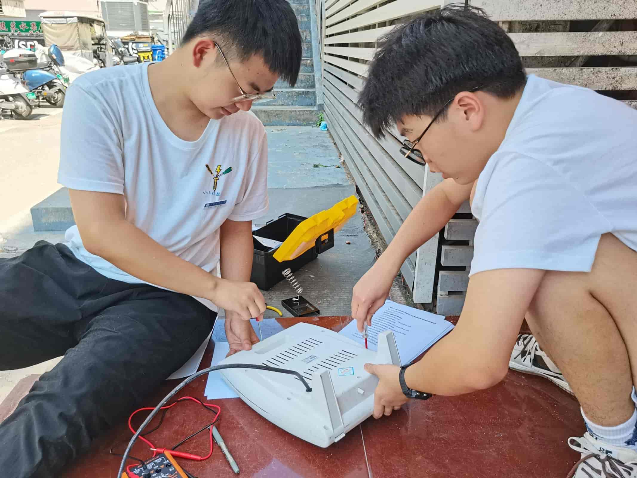 随后,团队成员帮助社区居民维修小型电器。团队成员借助所学电学知识,用相关的工具维修热电热水壶、电加热器等等。实践团成员先使用万用电表对线路进行测试,发现初步问题后将电器拆解,随后把损坏部分重连,最终通电检验,成功帮助居民将加热器修理完成。
