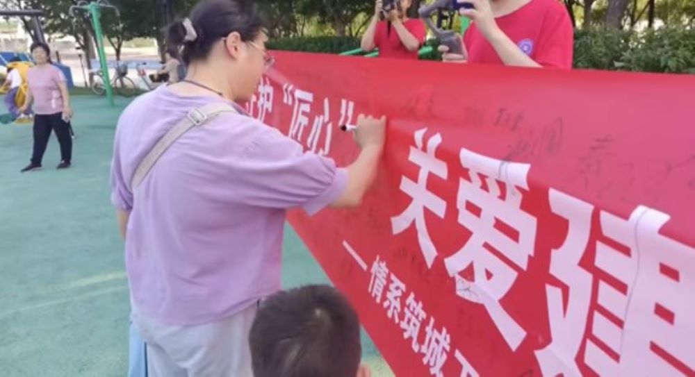 这次活动由“情系筑城工匠,砼辈奋楫笃行”实践团组织协助策划,吸引了大量市民的关注和参与。在得到当地安保人员的允许后,实践团的成员们在公园内悬挂一张红色横幅,鲜艳的横幅上写着“守护匠心,关爱建筑工人”,表达了市民对建筑工人的支持和感激之情。市民们排队有序地等待他们签字的机会,用自己的方式表达对建筑工人的敬意。