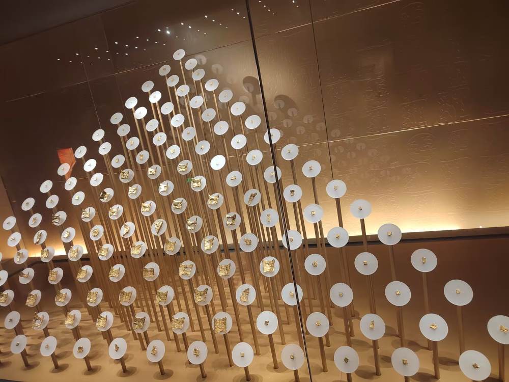 调研小组的成员在一块金字塔型的摆件面前驻足,上面摆满了金钣,这些金钣都是战国时期的高额辅助称量货币,用于大宗商贸活动。不同的金钣上刻有着不同的图案,一些上面刻有战马,象征着战争胜利的荣耀;还有一些刻有植物和昆虫的图案,可能象征着对大自然的亲近。金钣的形式有龟板形,方形,楔形等形状楚金币是楚文化的重要代表之一,楚金币的制作技术非常高超,既显示了楚国古代金属冶炼和工艺的水平,也展现了楚文化的繁荣和辉煌。这些金币也是交流和贸易的媒介,反映了楚国与其他国家的经济往来和文化交流。楚金币的存在,不仅是楚文化的宝贵遗产,更是中华民族五千年文明的一部分。
