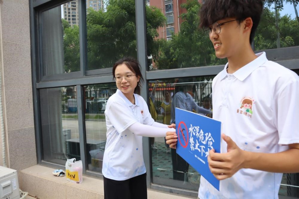实践队队员向学生们宣传暑期游泳注意事项。(林欣怡 摄)