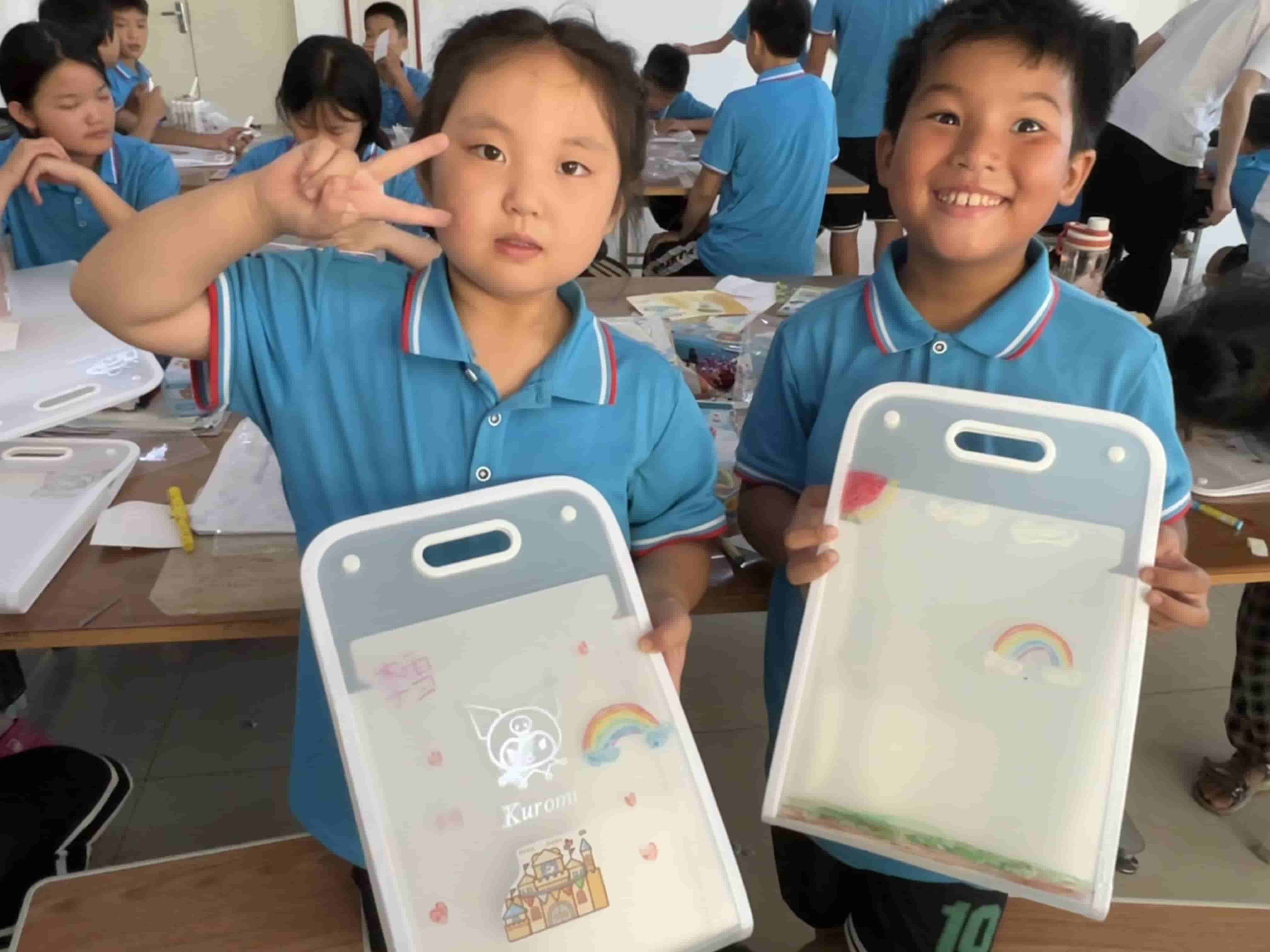 课程的最后,孩子们将自己的学习资料小心翼翼地放到收纳包中,带着满意的笑容,满怀自豪地向大家展示。所有人对孩子们的创造力和努力都表现出无限赞赏,同学们通过收纳包展现出了自己的个性和勇气。