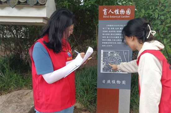 图为实践队员正在学习盲人植物园的平面规划图。