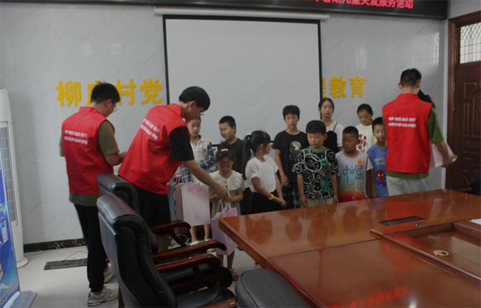 当日下午两点,留守儿童慰问会议在柳庄村党群服务中心会议室召开。指导老师段亚西与志愿者们了解了当地留守儿童的基本情况,并和孩子们进行了亲切的交流。赠礼仪式上,队员向孩子们送出了自己准备的文具礼品,小小的心意化作礼物陪在孩子们身边,愿孩子们能够勇敢长大,健康成长。会议最后,吕书记指出乡村中多数年轻人经常外出工作,留守儿童的情况依然存在,希望大家能对孩子们多加关爱,让社会更加关注这个群体。