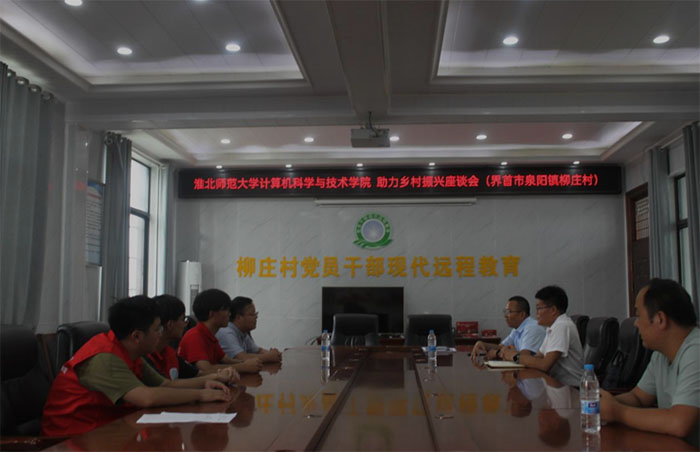2023年7月21日上午,团队在柳庄村党群服务中心会议室召开了座谈会。会议上,界首市王烈桥中心学校郭力校长表达了科技助力乡村振兴的必要性,强调了当今的乡村振兴离不开信息技术的支持,青年一代是乡村振兴蓬勃发展的希望,更是祖国未来发展的希望。驻村第一书记兼驻村工作队队长吕奇表达了对柳庄村未来发展的无限期望,希望能够有更多的信息科学技术能够助力到乡村发展上,为农村发展注入新的活力,也欢迎更多的淮师学子加入到柳庄村振兴团队。