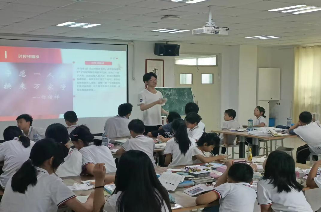 (实践团成员解少炫向孩子们分享时传祥红色故事)