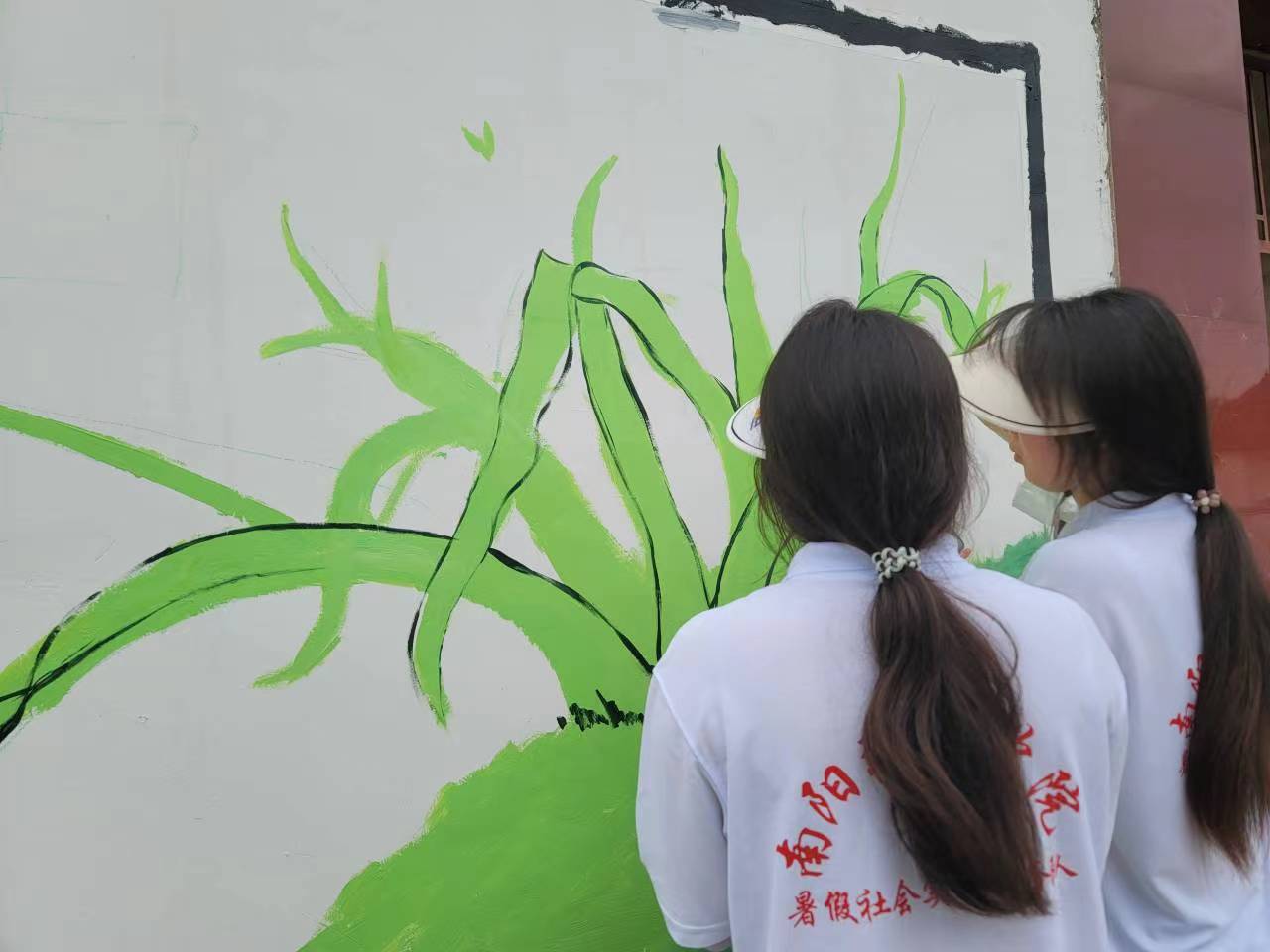 图为志愿者在给墙绘填色 王世豪 摄