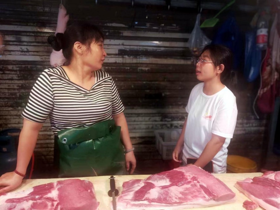 图为团队成员采访卖肉铺子老板。中国青年网通讯员朱沙沙摄