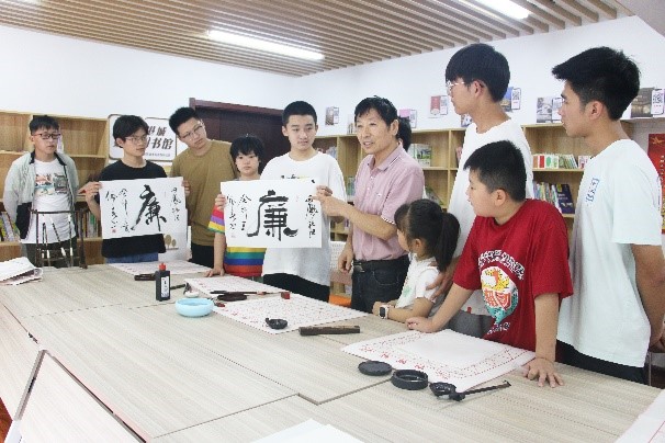 志愿者协助书法老师从书法的演变、书法字体等知识入手,不仅带领同学们领略了汉字的生命力和艺术魅力,体会到写字与做人的道理,同时为同学们讲授了书写技巧,耐心地解答了他们在书法练习方面的一些困惑,激发了同学们学习书法的热情。