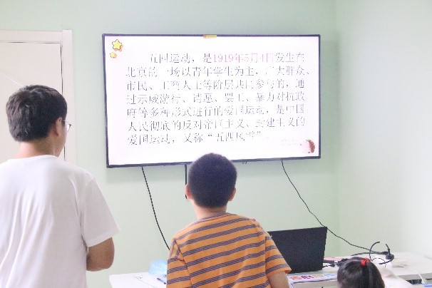 志愿者同学们介绍了五四运动的历史背景和深远意义,通过图片和视频展示,将历史故事融入到趣味游戏和小组讨论中,带领同学们重温那段峥嵘岁月。