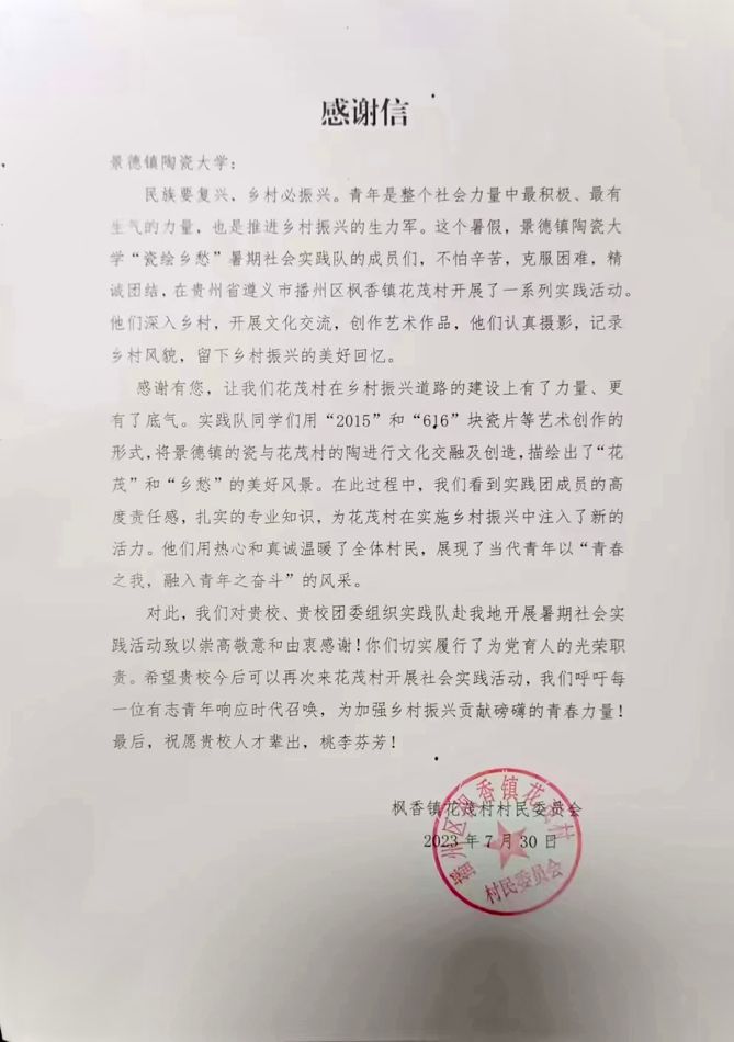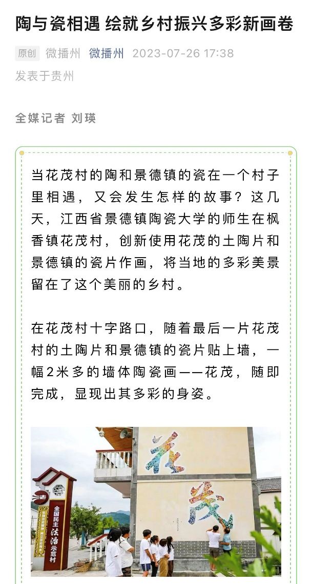 此次墙绘创作不仅是对贵州独特自然风光的赞美,更是对当地乡村振兴的生动宣扬,为新农村勾勒出一道道美丽的风景线。本次活动得到了枫香镇花茂村的大力支持与高度肯定。同时,本次墙绘创作获得了当地媒体的独家报道与村民委员会发来的感谢信,表达了对景德镇陶瓷大学青年学子扎实的专业能力的高度赞扬。