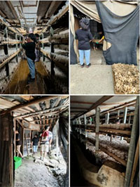 午后,实践队集体前往古田县凤都镇,探访了当地种植规模最大的传统草菇种植基地。队员们跟随负责人来到了菇棚内部参观,刚进棚便有一股腐烂味扑面而来,抬眼望去,菇架上面铺满了发酵过的干草堆,尚未采收的草菇零零散散地分布其上。