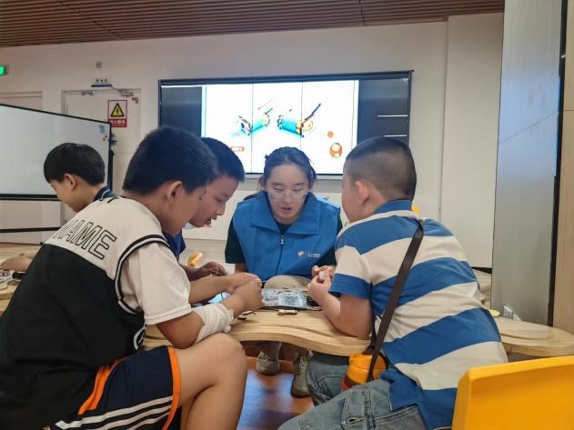 志愿者带领小朋友进行小车的组装