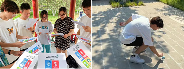 在实践过程中,团队成员利用设计好的垃圾分类主题宣传海报,以及所学的垃圾分类相关知识,以分组的形式为公园内的游客进行垃圾分类相关知识的科普宣传。同时,小组成员密切关注公园生态情况,捡拾地面垃圾并投放到对应分类的垃圾桶内。