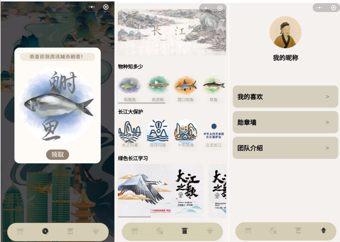 小程序第三页分为物种知多少、长江大保护、绿色长江学习三个科普板块。