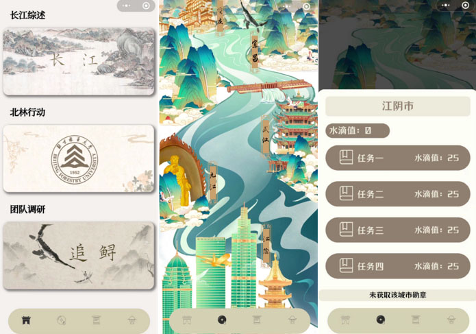 小程序首页分为长江综述、北林行动、团队调研三个板块。