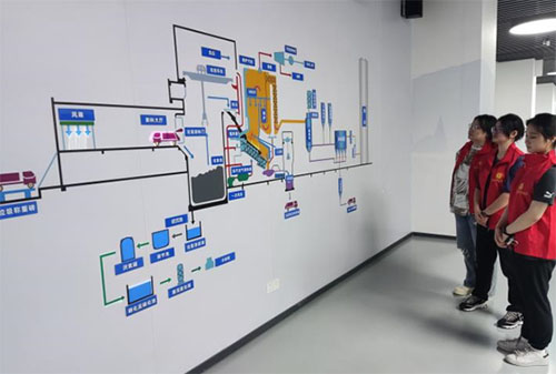 图为团队成员学习惠联热电垃圾焚烧发电工艺流程图。