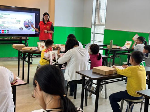 图为实践团成员进校园,与外籍教师共同交流分享“垃圾分类,低碳生活”知识。