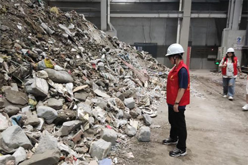 图为实践团成员走进建筑垃圾再生工厂,现场勘查建筑垃圾现状。