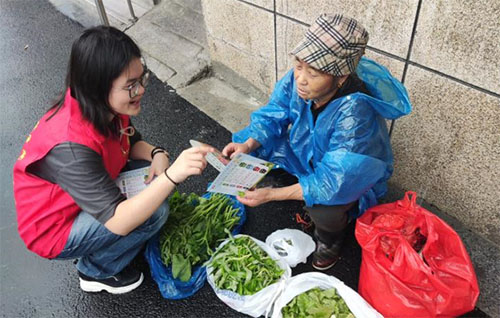 图为实践团成员进农贸市场,给商贩讲解市场内“餐余垃圾”的种类。
