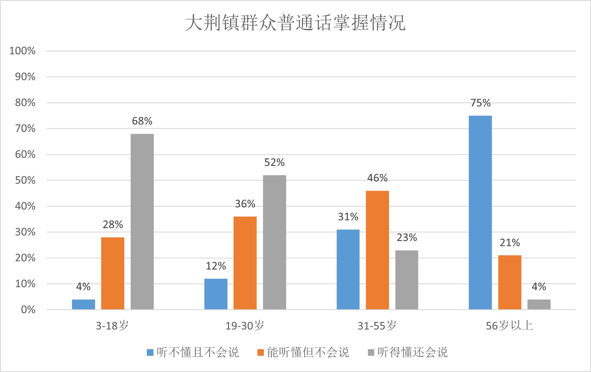 调查显示,大荆镇3-18岁群众听不懂且不会说的占4%,能听懂但不会说的占28%,听得懂还会说的占68%;19-30岁群众听不懂且不会说的占12%,能听懂但不会说的占36%,听得懂还会说的占52%;31-55岁群众听不懂且不会说的占31%,能听懂但不会说的占46%,听得懂还会说的占23%;56岁以上群众听不懂且不会说的占75%,能听懂但不会说的占21%,听得懂且会说的占45%。据此数据得知,大部分群众普通话水平较低,其中中老年群体对普通话能力的掌握水平最低,青少年年总体情况较好。总体来说听得懂的群众占比较大,会说普通话的占比较小。据此分析认为,这种现象可能是由于青少年对于普通话接触较早,且在学校生活中具有一定的语言环境和氛围,但老年群体缺乏语言环境,也没有使用需求,所以导致中老年群体普通话水平较低。