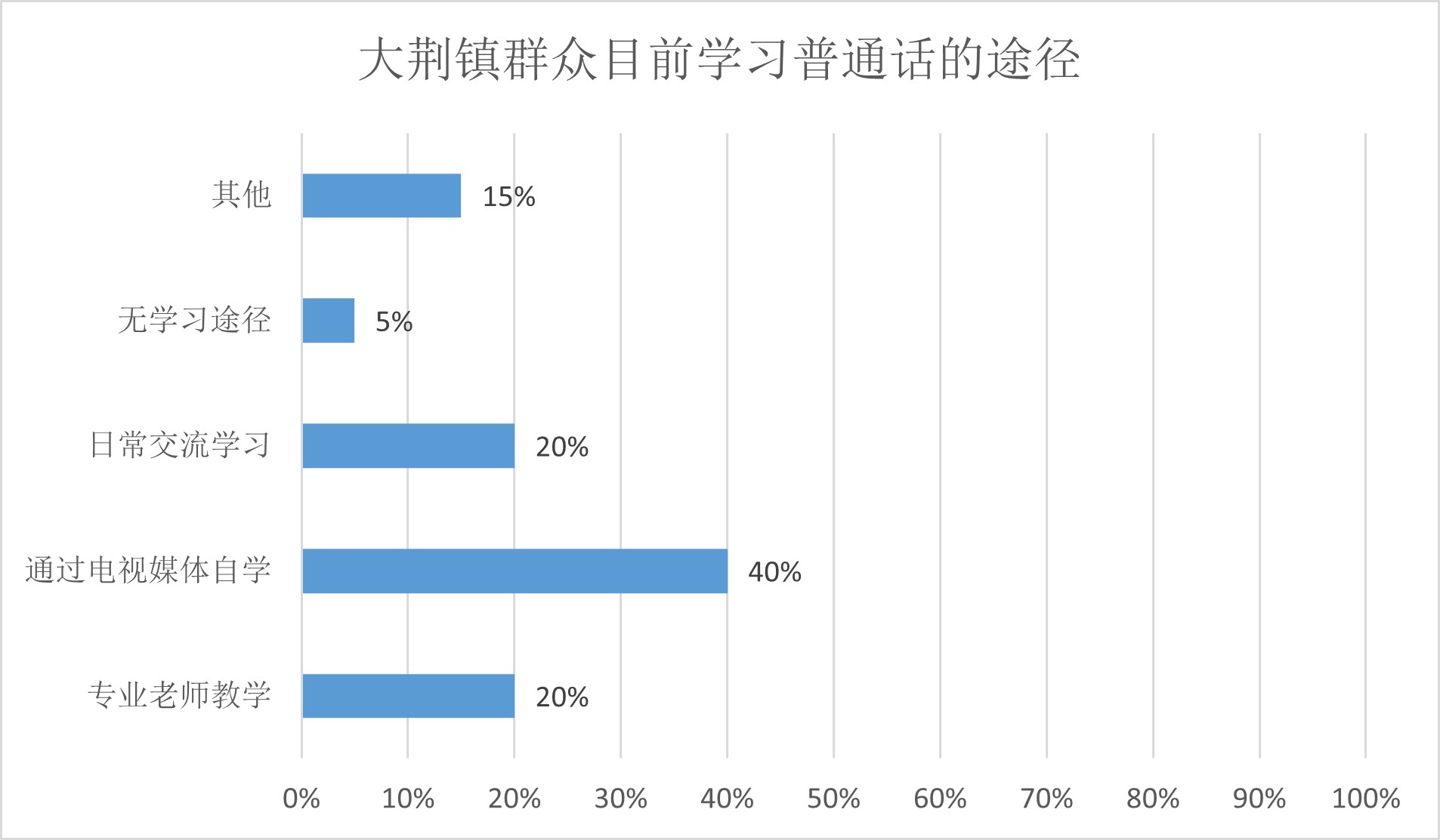 调查显示,大荆镇群众通过专业老师教学学习的占20%,电视媒体自学占40%,日常交流学习占20%,无学习途径占5%,其他占15%。据此分析认为,大部分人学习普通话主要是通过媒体、日常交流来自学,一部分学生和专业领域的工作可能有专业的普通话老师教学,可见目前普通话学习途径相对过去有所扩大,主要还是依托于现代科技水平的提升。