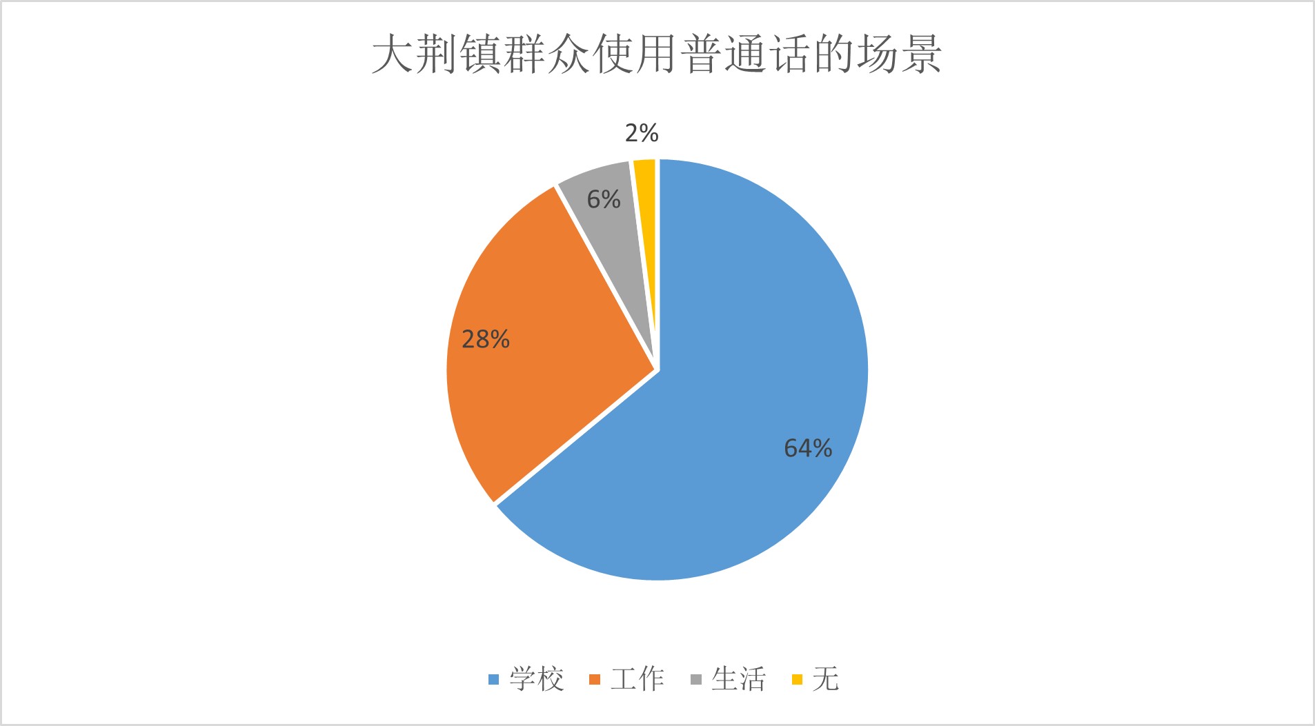 调查显示,大荆镇群众使用普通话的场景64%为学校,28%为工作,6%为生活,2%没有使用场景。据此分析认为,大荆镇群众普通话水平较低的原因包括当地群众在日常生活中,没有使用普通话交流沟通的习惯和需求。
