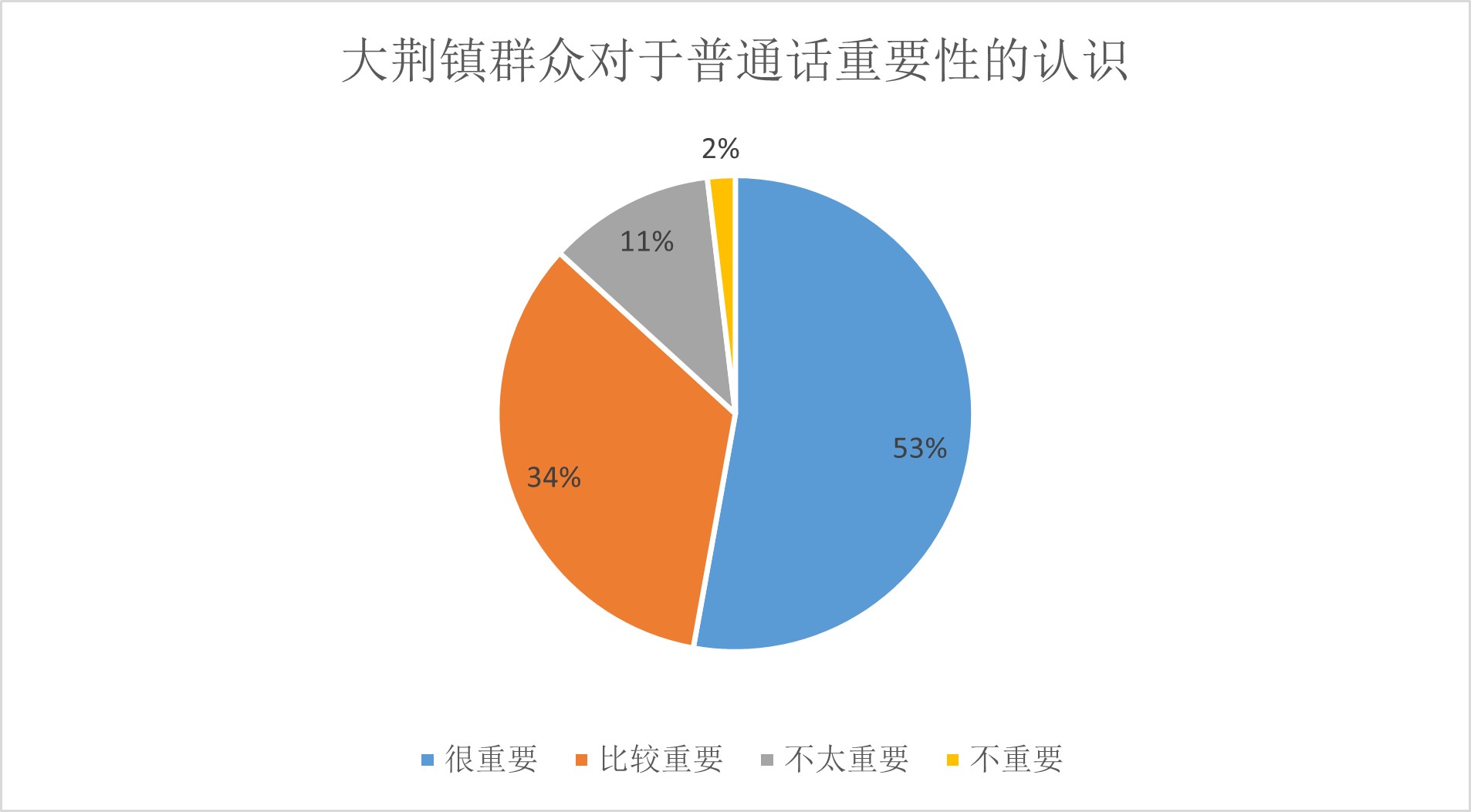 调查显示,大荆镇群众认为普通话很重要的占53%,认为比较重要的占34%,认为不太重要的占11%,认为不重要的占2%。据此数据分析,大部分群众对普通话的认识比较积极,但有少部分群众对于普通话的认识还比较消极,这表明虽然我国推普事业取得了一定成果,但推普的工作依然任重道远。